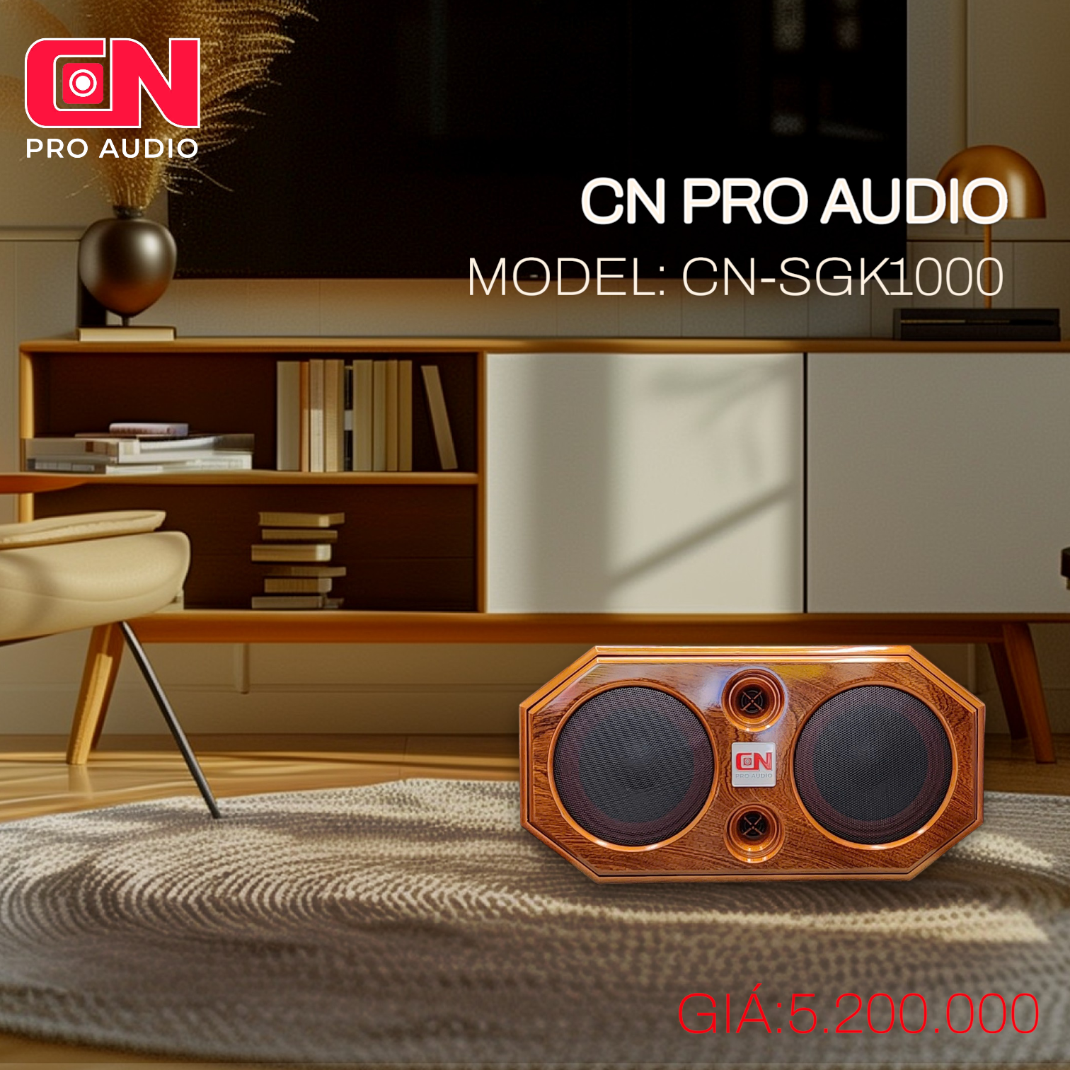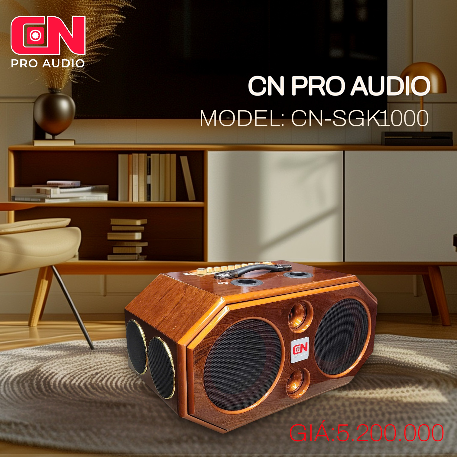 CN-SGK1000 là mẫu loa karaoke xách tay công suất cao có thể sử dụng không gian trong nhà , mang đi du lịch. Thiết kế siêu đẹp với chất liệu thùng vân gỗ sơn bóng pu, đầy đủ các chức năng. Sở hữu công suất 520w, 8 loa 3 đường tiếng gồm 2 bass 20cm và 4 treble mid 10cm và 2 treble NEO cao cấp với dòng micro uhf cho giọng ca sáng mượt